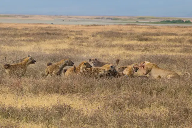 ไฮยีน่าและสิงโตมีหลายสิ่งที่เหมือนกัน แต่นิสัยและถิ่นที่อยู่อาศัยที่เหมือนกันทำให้พวกมันกลายเป็นศัตรูที่ดุร้ายซึ่งกันและกัน ไฮยีน่าขึ้นชื่อเรื่องการกินเหยื่อทั้งเป็นเพื่อป้องกันไม่ให้สิงโตหรือสัตว์นักล่าขนาดใหญ่อื่นๆ ล่าเหยื่อ นอกจากนี้พวกมันยังขึ้นชื่อเรื่องการล่าสิงโต ด้วยกรงเล็บที่แหลมคมและฟันที่สามารถบดขยี้เข้าถึงกระดูก