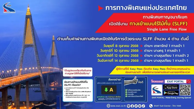นายสุรเชษฐ์ เหล่าพูลสุข ผู้ว่าการการทางพิเศษแห่งประเทศไทย (กทพ.) กล่าวว่า เพื่อเป็นการอำนวยความสะดวกให้กับผู้ใช้ทางด่วน ขณะนี้ทาง กทพ.ได้เปิดช่องทางเข้าแบบไร้ไม้กั้น (Single Lane Free Flow : SLFF) บนทางพิเศษกาญจนาภิเษก ซึ่งเป็นการนำเทคโนโลยีระบบตรวจจับป้ายทะเบียนรถยนต์อัตโนมัติ (Automatic License Plate Recognition : ALPR) ร่วมกับระบบตัดค่าผ่านทางผ่านบัญชี Easy Pass โดยผู้ใช้บริการไม่ต้องหยุดรถหน้าด่านฯ ช่วยลดความแออัดของการจราจรบริเวณด่านเก็บเงิน ประหยัดเวลาและเชื้อเพลิง ลดการปล่อยก๊าซคาร์บอนไดออกไซด์ และสามารถเดินทางได้อย่างต่อเนื่องแบบไร้รอยต่อ เพื่อเพิ่มความสะดวก รวดเร็ว แก่ผู้ใช้ Easy Pass เดินทางได้รวดเร็ว ปลอดภัย